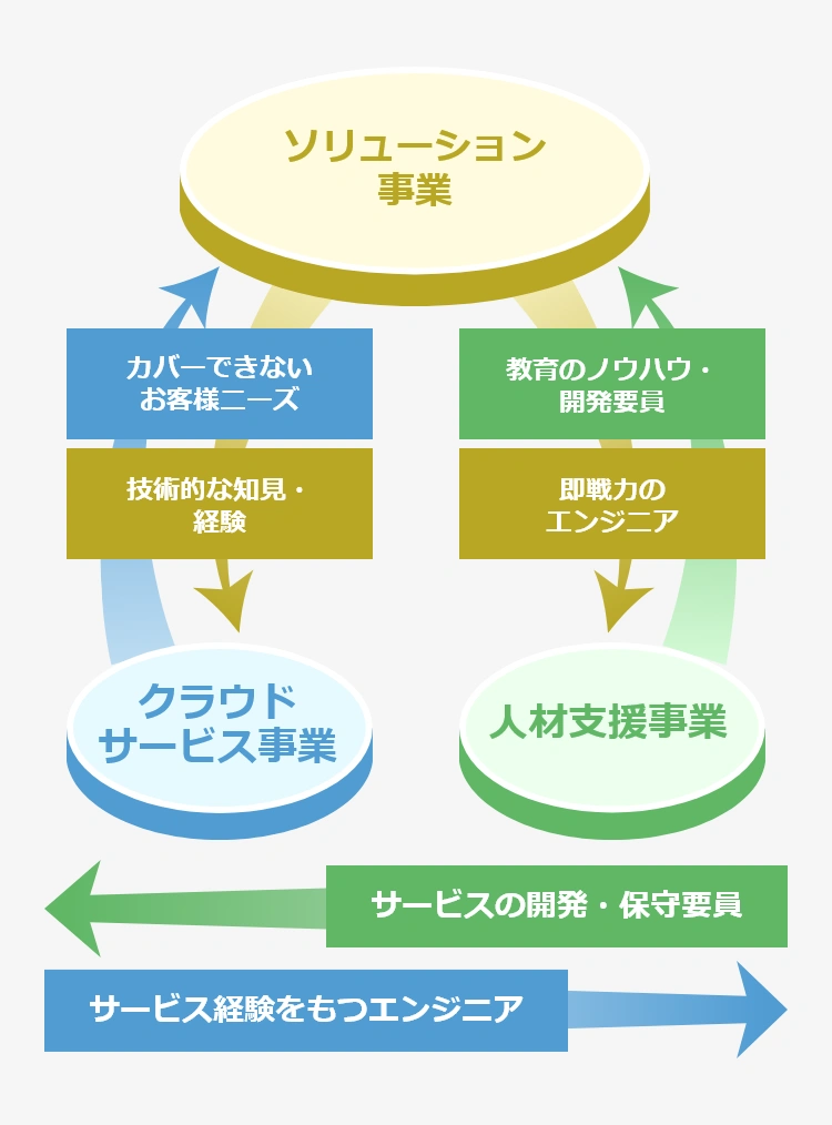 ソリューション事業、クラウドサービス、人材支援事業の3つの柱を互いに補完しあうことで、お客様に最高の付加価値を提供します。